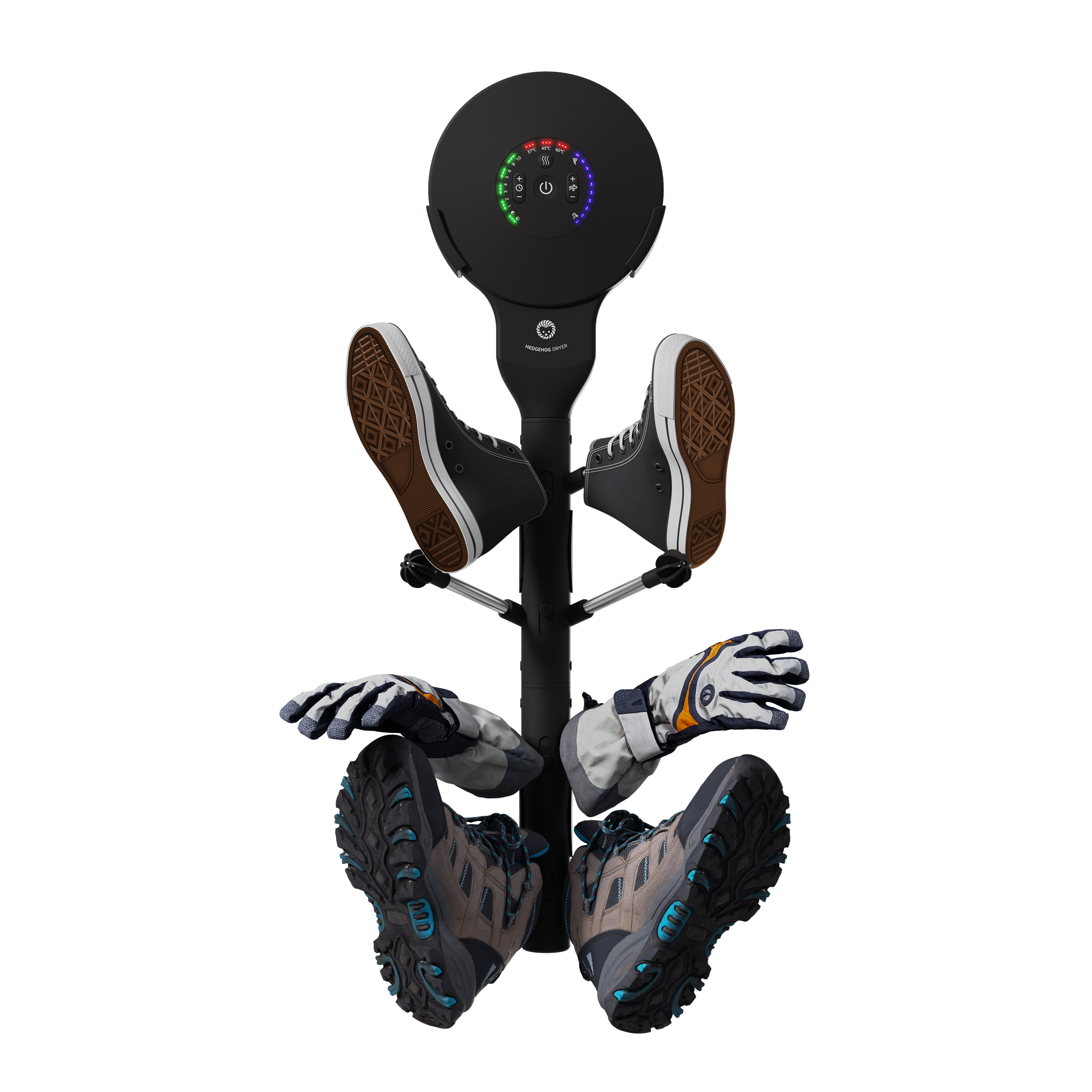 Our patented technology creates a high powered airflow that pushes the humidity out of the fabric in the shoes or gloves you are drying.